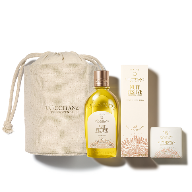 В состав подарка входит: Крем для рук 150 мл, Масло для душа 250 мл, Мыло 50 гр. Фирменная косметичка и пакет.
