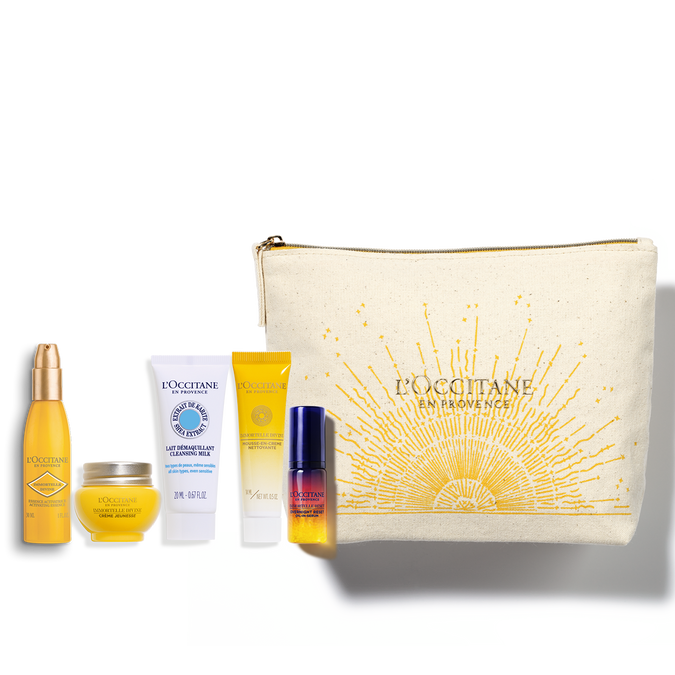 В набор входит: Крем для лица 8 мл, Ночная сыворотка 5 мл, Пенка для лица 14 мл, Молочко для умывания 20 мл, Лосьон для лица 30 мл, Фирменная косметичка и пакет.
