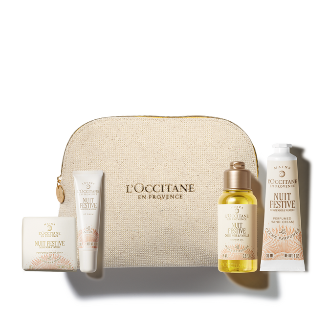 В набор входит: Крем для рук 30 мл, Масло для душа 75 мл, Молочко для тела 20 мл, Мыло 50гр, Фирменная косметичка и пакет.