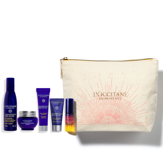 В набор входит: Крем для лица 8 мл, Тоник для лица 30 мл, Бальзам для глаз 4 мл, Ночная сыворотка 5 мл, Эмульсия для лица 10 мл, Фирменная косметичка и пакет.