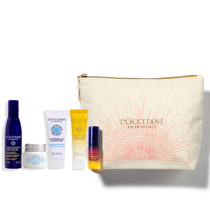 В набор входит: Тоник Бессмертник 30 мл, Пенка Дивайн 14 мл, Ночная сыворотка 5 мл, Крем для лица Карите 8 мл, Очищающее молочко Карите 20 мл, фирменная косметичка.