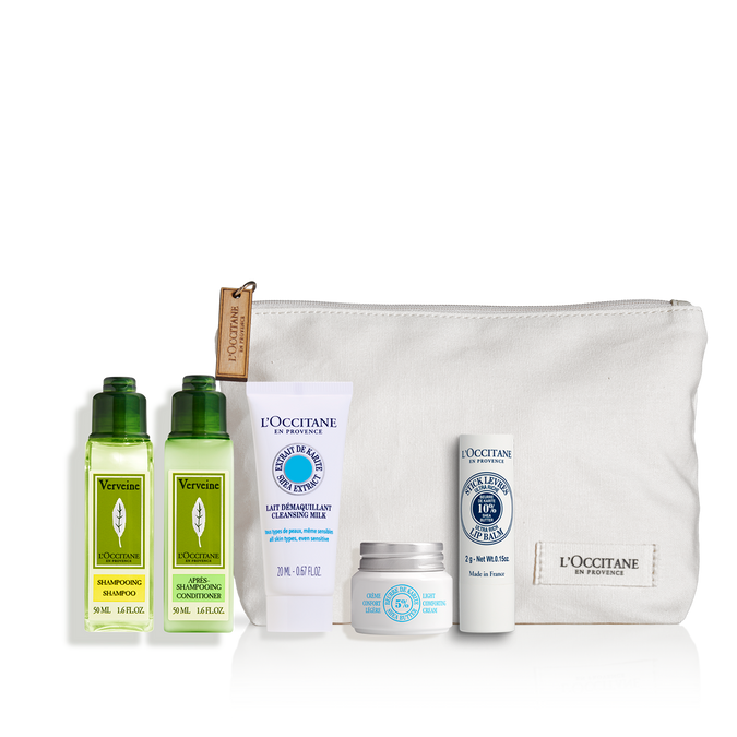 В состав набора входит: шампунь Вербена 75 мл, кондиционер Вербена 75 мл, крем для лица Карите 8 мл, бальзам для губ Карите 2 гр, молочко для снятия макияжа Карите 20 мл.