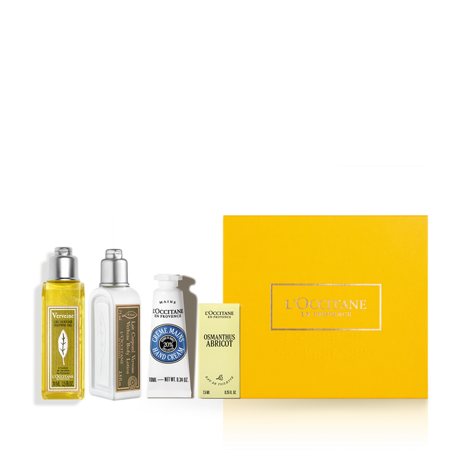 В набор входит: Крем для рук 10 мл, Гель для душа 70 мл, Лосьон для тела 70 мл, туалетная вода 7,5 мл, фирменная коробка и пакет.